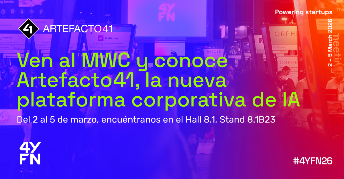 Este año estaremos en el 4YFN (MWC Barcelona) para presentar oficialmente Artefacto41, nuestra plataforma corporativa de acceso y gobierno de soluciones basadas en inteligencia artificial.